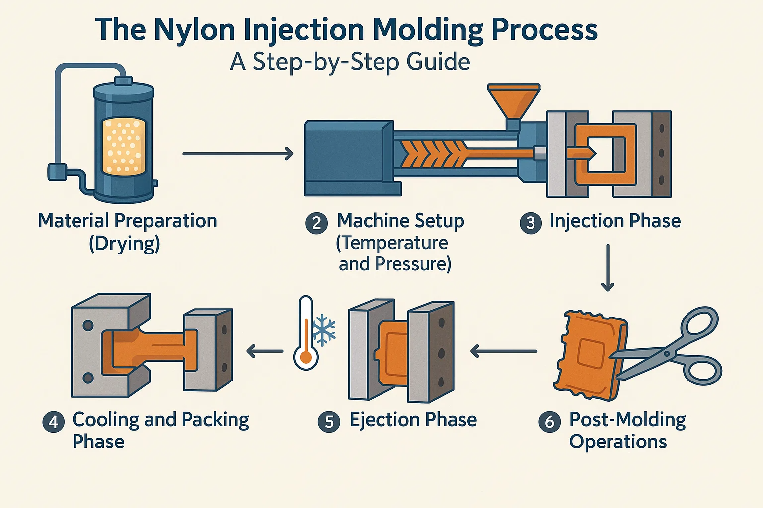 The process is fundamentally similar to the injection molding of other plastics, but it requires specific attention to temperature, moisture control, and injection pressure due to nylon's unique material characteristics (specifically its high melting point and hygroscopic nature).