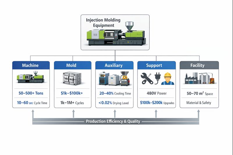 Injection molding requires a combination of machines, molds, auxiliary systems, and support infrastructure. Choosing the right equipment depends on part size, production volume, material type, and precision requirements. Missing any critical component can reduce product quality, slow production, or increase costs.